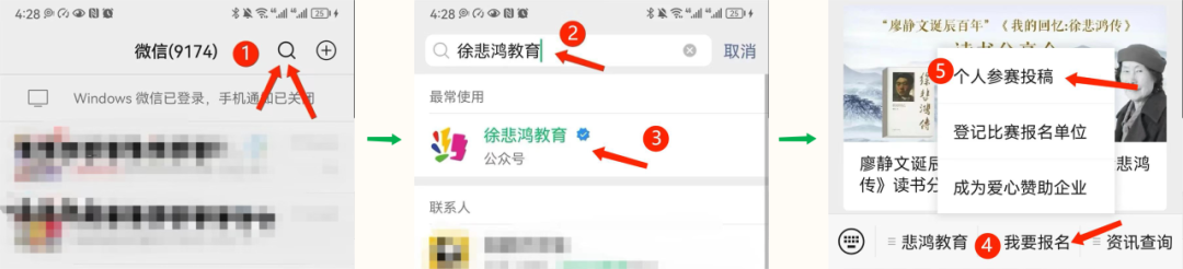 (3) 个人投稿的参赛者通过“徐悲鸿教育”微信公众号下方“我要报名”—“个人参赛投稿”按钮,进入投稿通道、填写作品资料,上传作品照片。